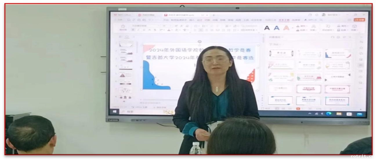 竞赛结束后,刘汝荣院长对赛事活动进行了深入而精彩的点评。她结合五位参赛老师的数字化教学成果指出现代数字化对教学的重要性。随着人工智能与大数据等技术的不断变革,时代要求我们必须打破传统的以知识传授为主的教学课堂,教师要充分利用数字化工具与资源改革课堂教学,体现时空突破,增强教学效果;能合理运用智慧教育环境中的人工智能、数据分析技术引导控制学习进程,有效调动学生自主学习与协作探究的积极性,进而全面提升教师教学综合能力,提升人才培养质量。2020年学校教务处也下发过通知要求所有专业课必须建立完整的网络课程,实行线上线下相结合的教学模式。今天参加比赛的五位老师走在了前面,他们主讲的课程均获批立项省级线上线下混合式一流课程。今天是同场竞技,更是我们外语人相聚一堂分享现代化的教学经验、探索高科技含量教学手段的大盛会。最后刘院长代表学院对参与此次竞赛活动的全体老师表示感谢。