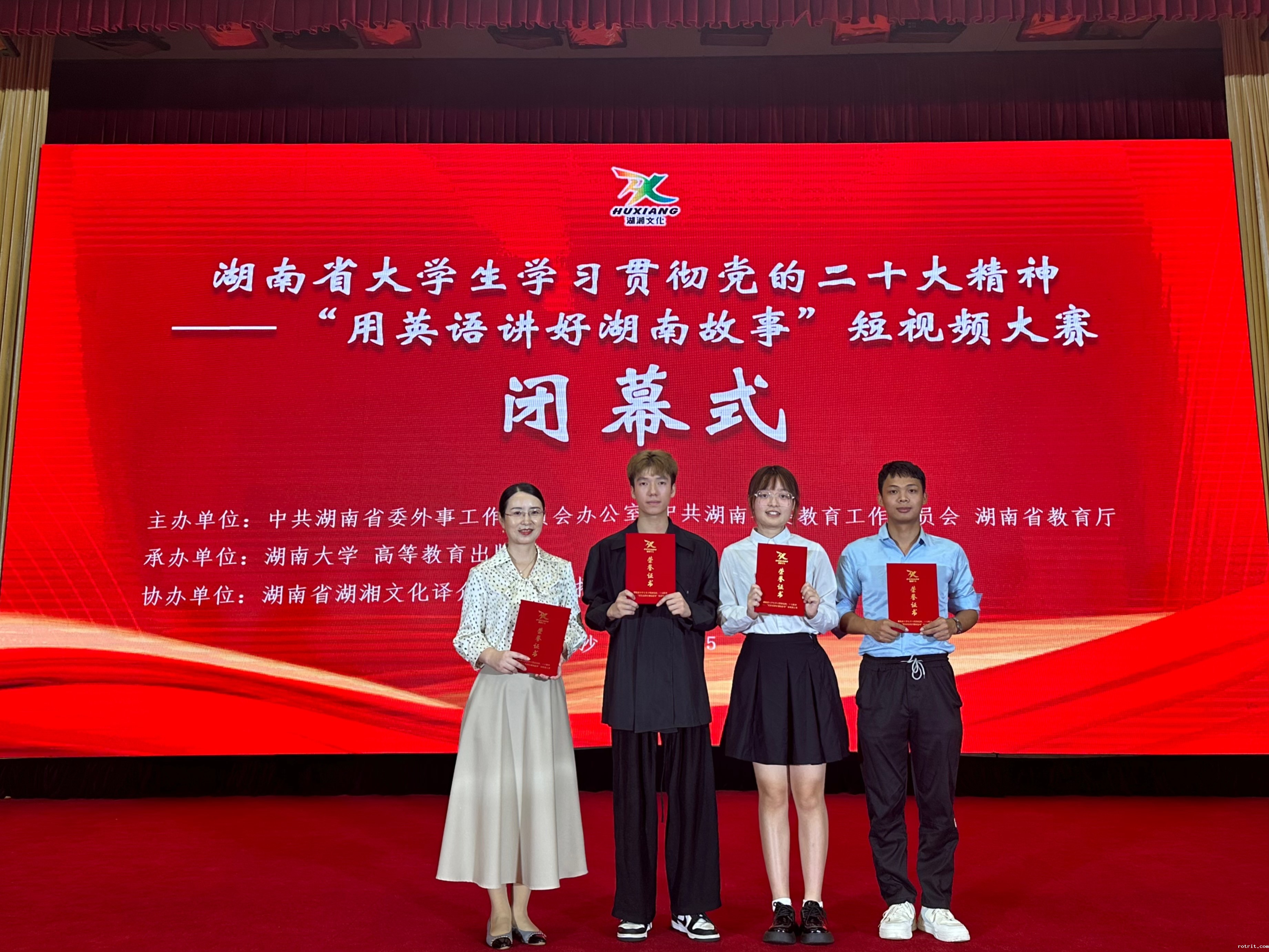 (通讯员 陈凯鹏 宋外飞)9月15日上午,由中共湖南省委外事工作委员会办公室、中共湖南省委教育工作委员会、湖南省教育厅主办,湖南大学、高等教育出版社承办的湖南省大学生学习贯彻党的二十大精神——“用英语讲好湖南故事”短视频大赛闭幕式暨颁奖典礼于长沙市举行。中共湖南省委外办副主任邱爱华、高等教育出版社总编辑谭方正致辞,湖南省教育厅一级巡视员罗桂香宣布获奖名单。本次大赛分本科组和高职高专组,全省高校踊跃参赛,最终全省116所高校共提交297件参赛作品,其中普通本科173件,高职高专124件。经过评审专家组的认真评审,本科组一等奖14件、二等奖21件、三等奖35件;高职高专组一等奖10件、二等奖15件、三等奖25件,12所高校荣获优秀组织奖。吉首大学选送的四件参赛作品全部获奖。伟德app帮助中心石琳副院长率一二等奖团队代表参加了此次颁奖典礼。