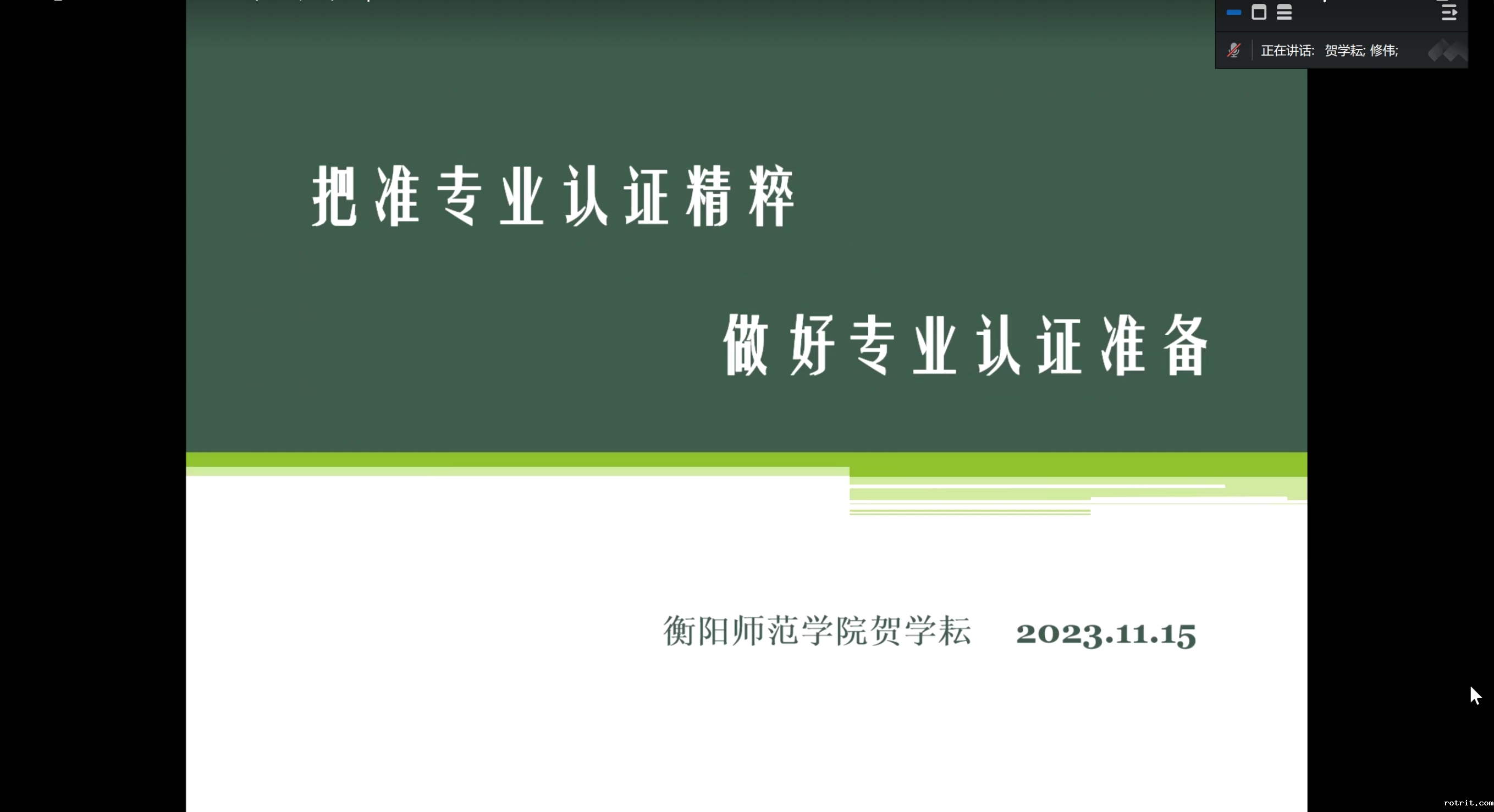 本网讯(修伟)11月15日晚7:00,受伟德betvictor1946娱乐邀请,衡阳师范学院贺学耘教授为学院教师作师范类专业认证专题报告,学院院长刘汝荣教授主持报告会,英语系、翻译系全体教师及学生辅导员全程出席,吉首校区相关授课教师以线上方式听取了报告。