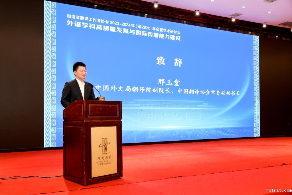中国外文局翻译院副院长、中国翻译协会常务副秘书长邢玉堂在致辞中指出,翻译是推动中国式现代化进程、促进中外交流互鉴的重要力量,翻译行业应更好服务国家工作大局,创新人才培养模式,深化协同协作,形成工作合力。他表示中国译协将加强行业规划,与各方携手努力,共同探索高端翻译人才培养新模式,推动我国翻译行业高质量发展。省翻译工作者协会会长曾艳钰教授总结了过去一年译协取得的工作成绩并呼吁省内译届精诚合作,共同开创我省外语教育与翻译事业新篇章。