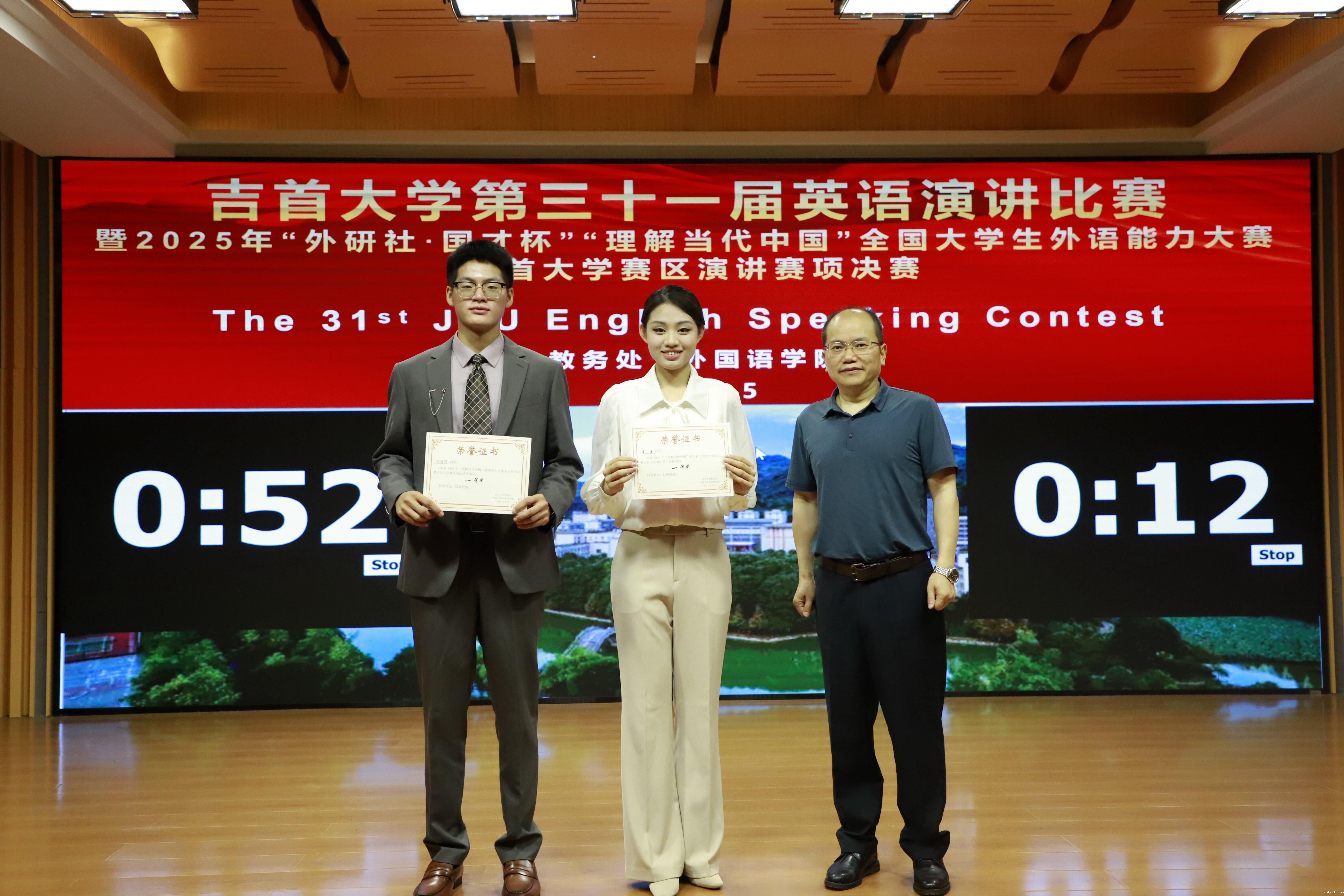 本次比赛为2025年“外研社一国才杯”“理解当代中国”湖南省大学生英语能力大赛演讲赛吉首大学选拔赛,20名参赛选手分别来自吉首与张家界两个校区。比赛分为“定题演讲”与“即兴演讲”两个环节,由彭洵、黎兴桥、马小燕等七位老师担任评委。教务处处长刘晗教授在致辞中表示,英语演讲比赛不仅是检验外语教学成果的重要平台,更是师生思想碰撞、共话时代使命的桥梁。