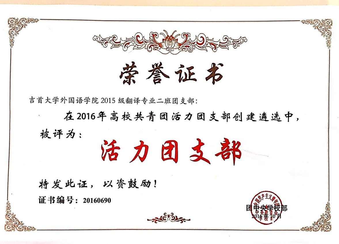 为贯彻落实《共青团中央改革方案》有关精神,深入实施高校基层团支部“活力提升”工程,团中央学校部于2016年秋季学期开展高校“活力团支部”创建遴选活动。此次活动面向全国各高校的学生团支部,包括班级、社团、活动项目、实验室、宿舍等各类学生团支部。经校内创建、省级遴选,全国共有1168个团支部进入全国遴选环节。经资格审核、网络投票和评审等环节,全国共有1000个团支部被确定为2016年全国高校“活力团支部”。经过层层选拔,我校伟德app帮助中心2015级翻译二班团支部最终脱颖而出,荣获全国高校“活力团支部”的荣誉称号。