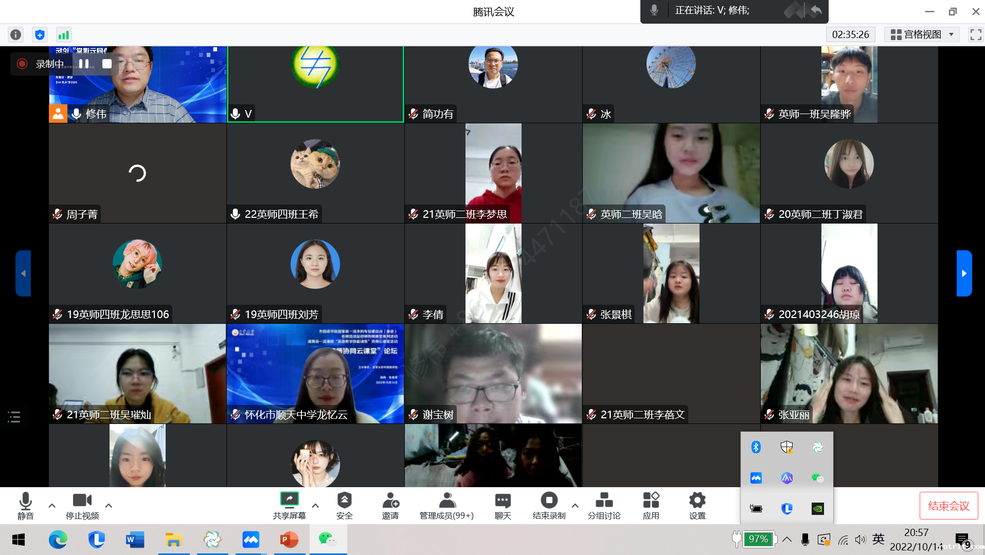 本网讯(修伟)10月14日晚,伟德app帮助中心名师流动站“双师协同云课堂”论坛在线上如期举行,邀请省级教学竞赛获奖者、来自怀化市鹤城区顺天中学石冰、龙忆云两位一线教师,以及我校中小学外语名师流动站首批驻站专家、来自张家界市教育科学研究院专职教研员伍杰作主题分享,拉开了该院为期一个月的国家级一流本科专业建设点(英语专业)名师流动站双师协同课堂系列活动暨湖南省一流课程(“英语教学技能训练”) 双师云课堂活动的序幕。该院院长刘汝荣、副院长简功友、外语教师教育课程团队教师及2019级、2020级全体师范生近300人与会。论坛由该院教师修伟主持。