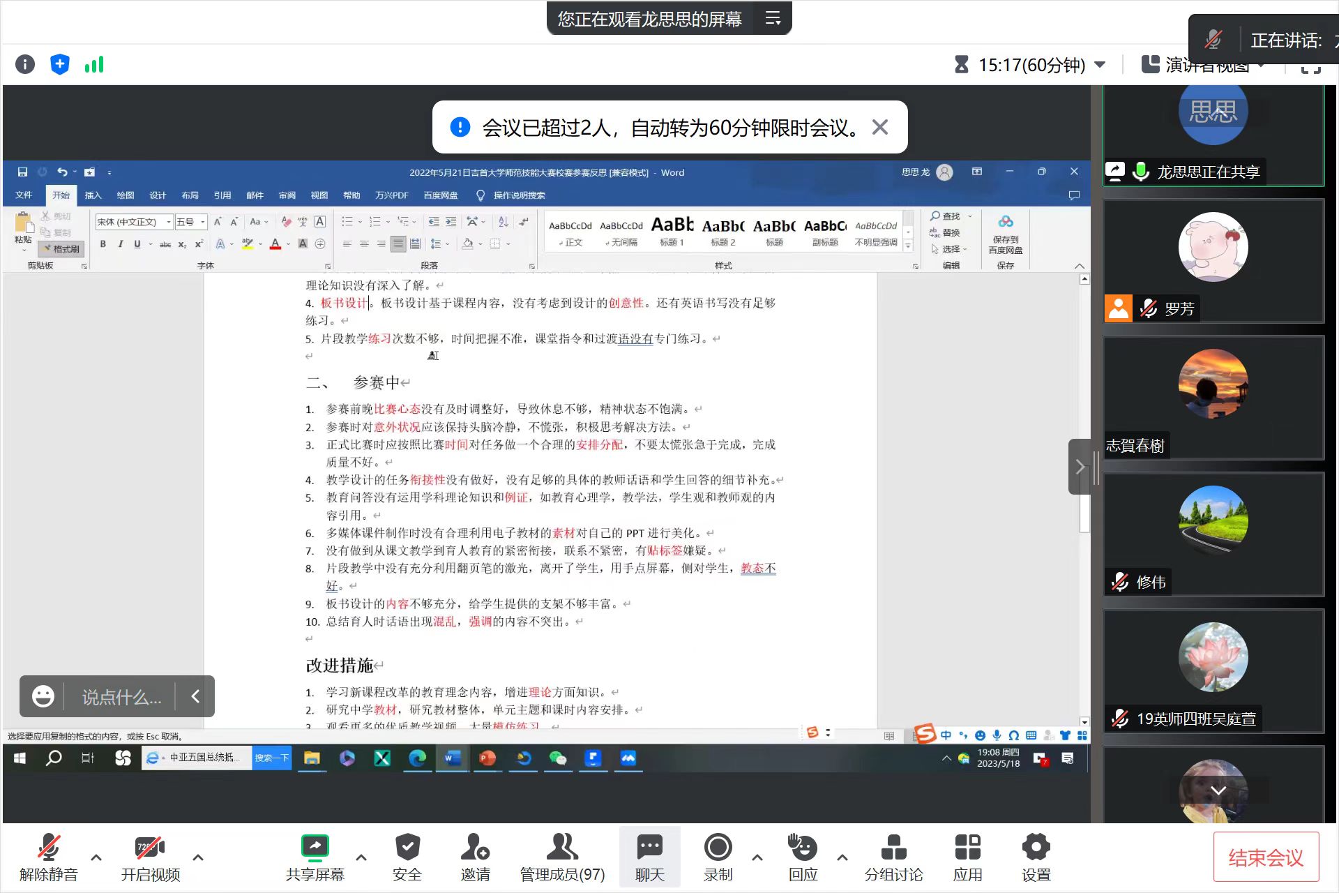 本网讯(龙思思,修伟)5月18日晚7:00, 英语定向师范生交流会于线上如期举行,来自2019、2020、2021和2022级四个年级的英语定向师范生全员出席。会议邀请了即将毕业的2019级英语定向师范生代表就专业学习、语言技能训练、英语教师技能实践、专业见习与顶岗实习等做主题分享。